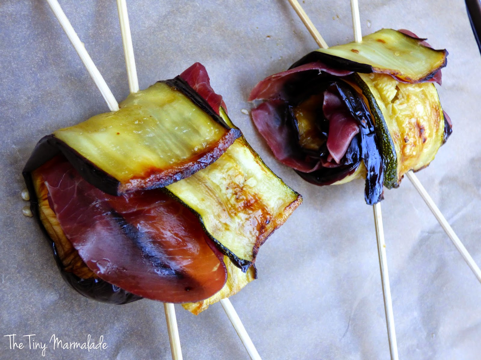 Put one slice of bresaola on top of every aubergine slice. Then put a slice of courgette and finally add some parmesan shavings.